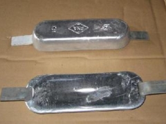 锌合金牺牲阳极用途:适用于海水、淡海水介质中的船舶、压载水舱、机械设备、海洋工程和海港设施、钻井平台、港口码头、海水介质的冷凝器、水泵以及低电阻率土壤中的管道、电缆等设施金属防腐蚀的阴极保护。